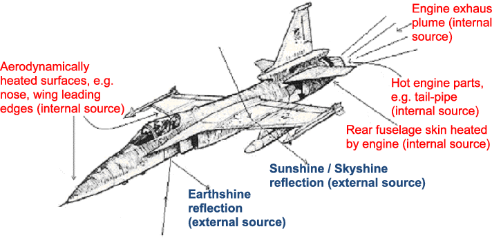 Reducing aircraft heat signature is required to prevent IR sensor tracking. The exhaust plume contributes a significant infrared signature. One means to reduce IR signature is to have a non-circular slit-shape tail pipe, to reduce the exhaust cross section area and maximize the mixing of hot exhaust with cool ambient air as is the case in F-117. Often, cool air is deliberately injected into the exhaust flow to boost this process. In some aircraft, the jet exhaust is vented above the wing surface to shield it from missiles observers below. Another way to reduce the exhaust temperature is to circulate coolant fluids such as fuel inside the exhaust pipe, where the fuel tanks serve as heat sinks cooled by the flow of air along the wings.