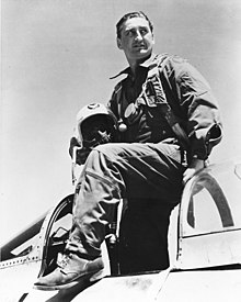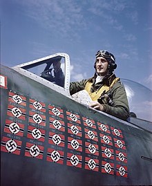 As a member of Hubert Zemke’s Wolfpack the 56th Fighter Group and commanded the 61st Fighter Squadron and became the leading American ace in Europe with 28 victories in 17 months. He ended World War II with 28 victories before becoming a POW at Stalag Luft I. During the Korean Conflict he scored 6.5 more combat victories over Korea, bringing his total to 34.5 and making him America’s top living ace.