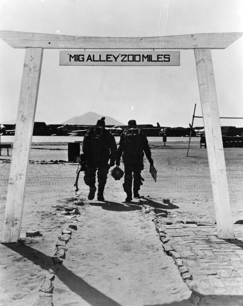 When Communist MiG-15s appeared, he experienced one of the frustrations that dogged all F-86 pilots at that time. The higher the Sabres flew, the more unstable they became, while the MiGs could fly higher and loiter longer because they were lighter and were close to their bases on the Chinese side of the Yalu River. When he flew his first mission against a target in “MIG Alley,” south of the Yalu River, for the first time in his life he could see the enemy, but was not permitted to attack them in their privileged sanctuary in Manchuria. The international border with North Korea was theoretically a line over which American interceptors could not cross, since China was not officially involved in the war. It was a difficult way to fight a war.
