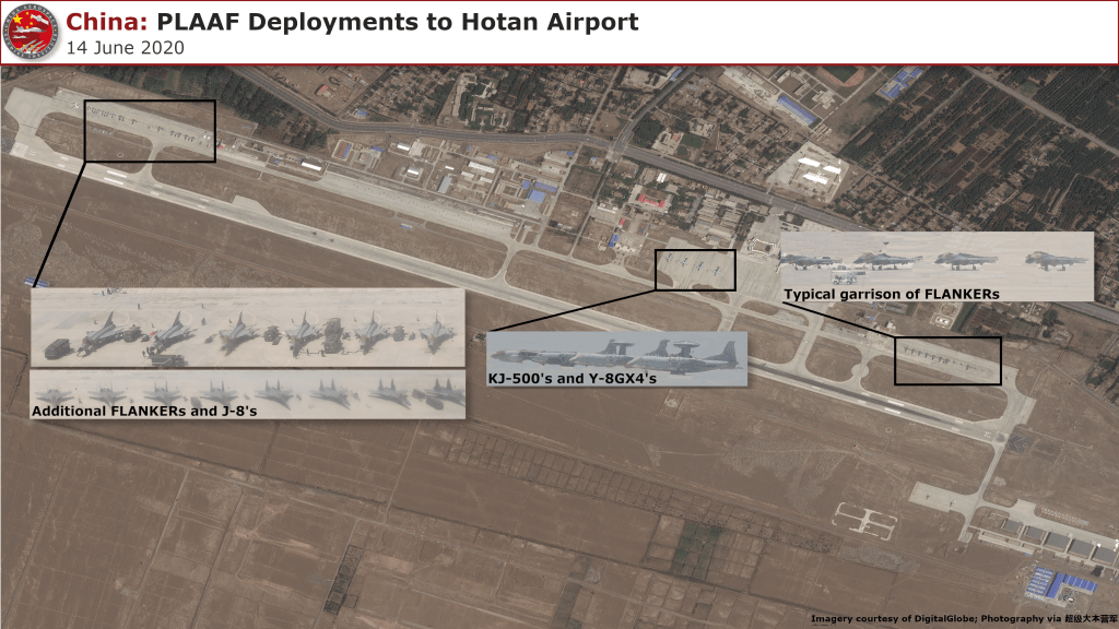 The second Chinese airfield of interest is Hotan in Xinjiang. This airfield is around 350 km from Leh and also from Galwan area. The airbase is at a relatively lower altitude of 1,424 m or 4,672 ft. Hotan is an active People’s Liberation Army Air Force (PLAAF) base where they have been holding regular exercises, including the Shaheen series with Pakistan. It has a runway which is 3,200 m or 10,499 ft long. Operations from this base could be significant. Normally, the PLAAF maintains roughly twelve unidentified FLANKER variants at Hotan Air Station and an unknown number of CH-4 UAVs. An air defense battalion garrisoned in Hotan provides the PLAAF with additional air defense capabilities in the region. To augment these forces already in theater, the PLAAF deployed a number of additional assets in early June 2020. Unverified handheld photography from early June 2020 and overhead electro-optical imagery from 14 June 2020 shows that the PLAAF has deployed an additional 24 aircraft to Hotan (Table Below)