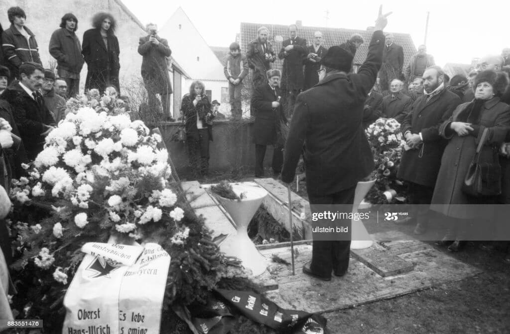 Rudel died after suffering another stroke in Rosenheim on 18 December 1982, and was buried in Dornhausen on 22 December 1982. During Rudel’s burial ceremony, two Bundeswehr F-4 Phantoms appeared to make a low altitude fly-past over his grave. Dornhausen was situated in the middle of a flight path regularly flown by military aircraft, and Bundeswehr officers denied deliberately flying aircraft over the funeral. Four mourners were photographed giving Nazi salutes at the funeral, and were investigated under a law banning the display of Nazi symbols. The Federal Minister of Defence Manfred Wörner declared that the flight of the aircraft had been a normal training exercise.