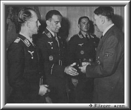 Rudel was promoted to Oberstleutnant (Lt Col) on 1 September 1944, and appointed leader of SG 2, replacing Stepp, on 1 October 1944. On 22 December 1944, Rudel completed his 2,400th combat mission, and the next day, he reported his 463rd tank destroyed. On 29 December 1944, Rudel was promoted to Oberst (colonel), and was awarded the Knight’s Cross of the Iron Cross with Golden Oak Leaves, Swords, and Diamonds, the only person to receive this decoration. No other German soldier has ever received it. This award, intended as one of 12 to be given as a post-war victory award for Nazi Germany, was presented to him by Hitler on 1 January 1945, four months before Nazi Germany was defeated. Present at the Eagle’s Nest, the Nazi western headquarters, were Col. Gen. Alfred Jodl, Grand Adm. Karl Dönitz, Field Marshal Wilhelm Keitel and Imperial Marshal Hermann Göring. Again Hitler ordered him grounded; again Rudel refused. The Führer smiled and said: “Very well then, fly. But be careful, the German people need you.”