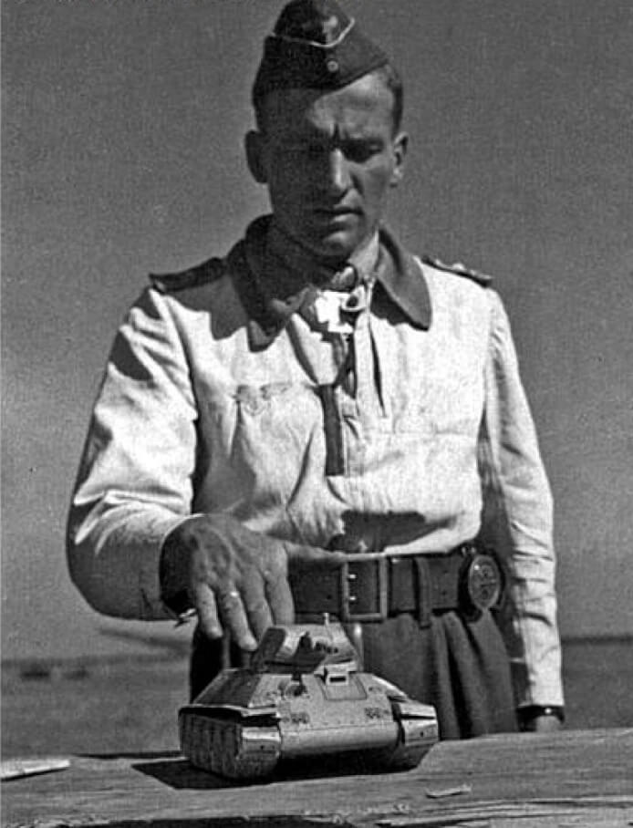 On 12 July 1943 as thousands of German and Russian tanks wheeled and fired at point-blank range below him, Rudel circled behind the enemy armor formations to attack from the rear. In his first attack he disabled four tanks, and by the end of the first day he had bagged 12—the equivalent of a Soviet armor company. He came in so low he risked being caught in the target’s explosion. “This happens to me twice in the first few days when I suddenly fly through a curtain of fire,” he reported. “I come out, however, safe and sound on the other side, even though…my aircraft is scorched and splinters from the exploding tank have riddled it with holes.”