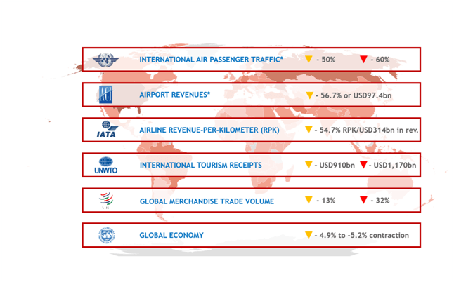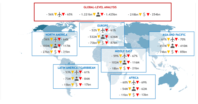 As tabulated by the ICAO in July 2020, the diagram shows that international passenger traffic is not likely to increase substantially in the short term. The yellow figures indicate the best-case scenario, which shows a reduction of almost 1.22 billion passengers worldwide, and the worst case scenario (red triangles) shows almost 1.43 billion passengers less. As for the losses, the amount could range between 218 to 254 billion dollars! The estimates in terms of percentages are detailed in the ICAO report as indicated below: