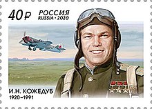 Ivan Kozhedub died on 8 August 1991. A special stamp was released to honour him by Russia in 2020.  A military university in Kharkiv is named in his honor, the Kozhedub University of the Air Force.