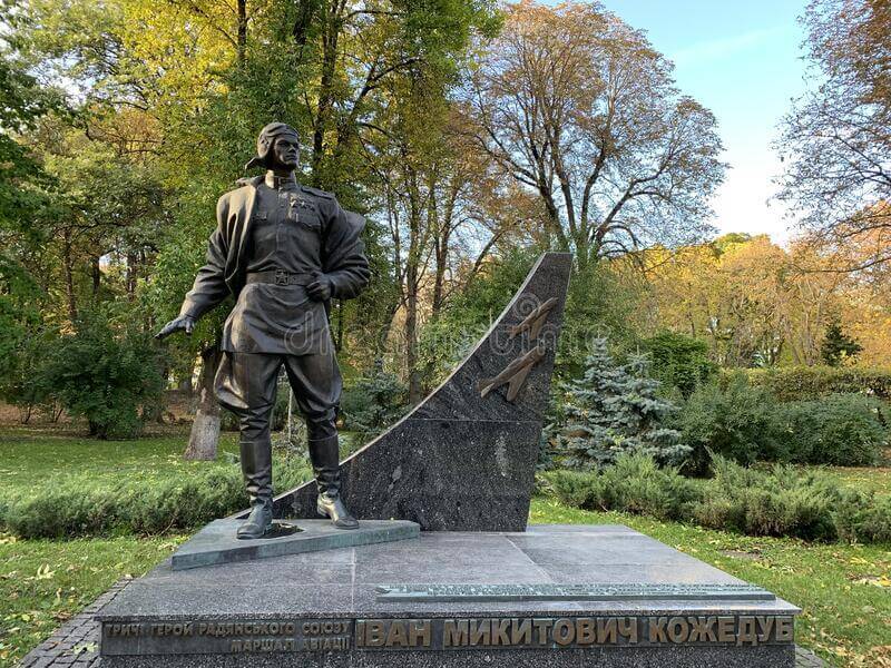 KIEV, UKRAINE : Monument to the hero of World War II fighter pilot Ivan Kozhedub in the park. Inscription: Hero of the Soviet Union, Marshal of Aviation Ivan Nikitovich Kozhedub. Image Source: dreamstime.com