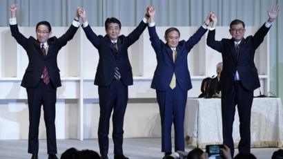 Yoshihide Suga (third from left) celebrates after winning the party leadership. Image Source: bbc.com