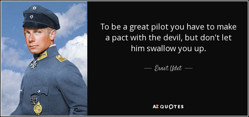 O’Brien Browne, describes this most aptly in “Ernst Udet: The Rise and fall of a German World War I Ace” written for History Net. He writes, “On a pale December morning in 1915 a single Fokker Eindecker monoplane sailed high above the clouds, hunting for prey over the Vosges sector of the Western Front. Its young, inexperienced German pilot, his face greased for protection from the cold, felt snug in his thick flight suit and sheepskin-lined boots. Eyes alert, he carefully scanned the vast expanse of seemingly empty blue sky. Suddenly, a glint of silver caught the pilot’s eye, moving toward him from the west. It was the enemy. Instead of manoeuvring above and behind his opponent, the novice pilot forgot all his combat training and simply flew head-on at the oncoming aircraft. As the enemy neared, the German recognized it as a French Caudron G.IV, a queer-looking machine with a twin-boom lattice tail section and a truncated tub between the plane’s two engines carrying the pilot and observer. As the German pilot reached for the firing button on the joystick, his mouth became dry at the prospect of his first aerial battle. The Frenchmen flew directly at him, looming so close that the observer’s head was clearly visible. The German pilot poised his thumb over the firing button, muscles tense. The moment of truth: kill or be killed. But as the two planes came within point-blank range of each other, paralyzing fear gripped the young German and he froze. He stared at his opponent, helpless. A second later, he heard popping noises and felt his Fokker shudder. Something slapped hard against his cheek and his goggles flew off. His face was sprayed with broken glass, and blood trickled down his cheek. With the French observer still firing, the German dived into a nearby cloud and limped back to his airfield. Once his wounds had been dressed, he secluded himself in his room and spent a sleepless night berating himself for cowardice and stupidity. Such was the inauspicious beginning of one of the most remarkable flying careers of the first half of the 20th century. The young pilot’s name was Ernst Udet”.