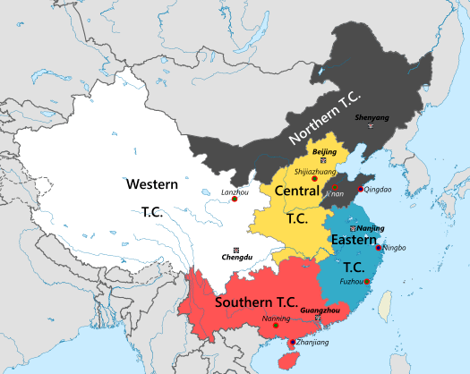 As part of the 2015 People’s Republic of China military reform, China established five joint theatres. The five theatres are Eastern Theater Command with headquarters in Nanjing, Southern Theater Command with headquarters in Guangzhou, Western Theater Command with headquarters in Chengdu, Northern Theater Command with headquarters in Shenyang, and Central Theater Command with headquarters in Beijing. All are within China. A model typical of a regional power.