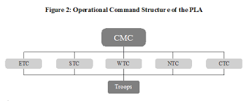 The theatre commander is responsible to the Central Military Commission which is headed by Xi Jinping. The chain of command is direct – between the theatre and the Chairman of the Military Commission, in this case also the Head of the State. It is a one-to-one relationship. Similar to the US system, resources allocated to each theatre enable it to carry out assigned tasks. Each service HQ also reports directly to the CMC.