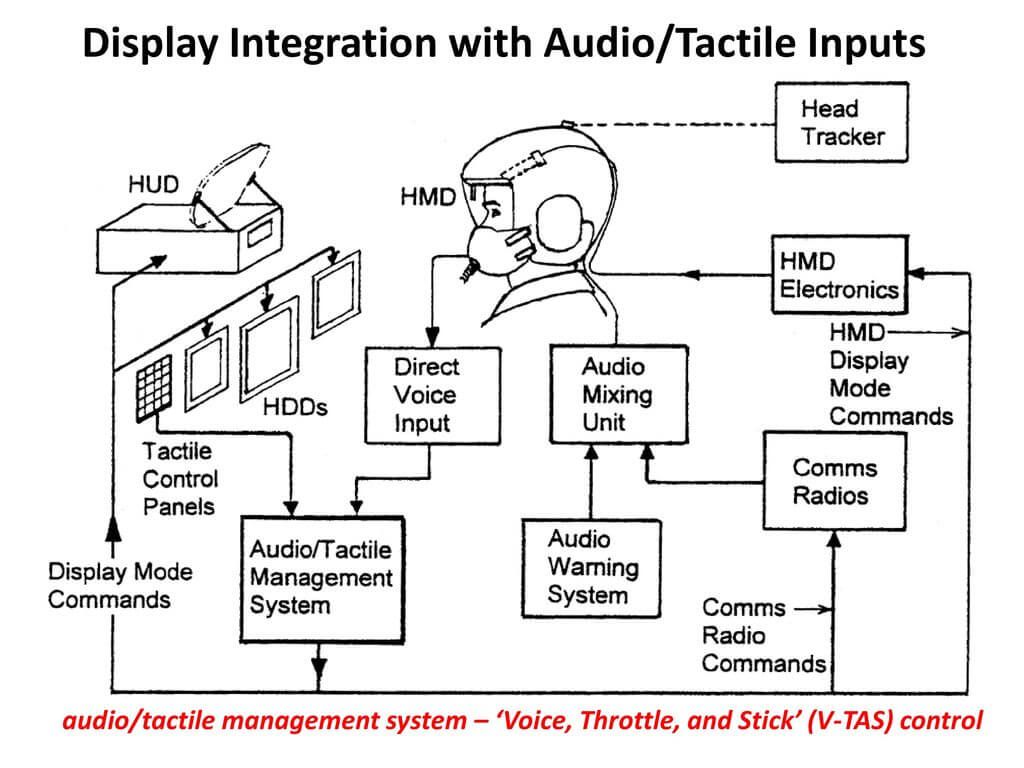 The modern cockpits do not anymore have those traditional “knobs and dials”. Instrument panels are now almost wholly replaced by electronic displays, which are themselves often re-configurable to save space. While some hard-wired dedicated switches are still there for safety, but most traditional controls are replaced by multi-function re-configurable controls or “soft keys”. Controls are incorporated onto the stick and throttle to enable the pilot to maintain a head-up and eyes-out position, and are called “Hands on Throttle and Stick” or HOTAS. These controls are further augmented by Helmet Mounted Sighting System or Direct voice input (DVI). Advances in auditory displays allow for Direct Voice Output of aircraft status information and for the spatial localisation of warning sounds for improved monitoring of aircraft systems.